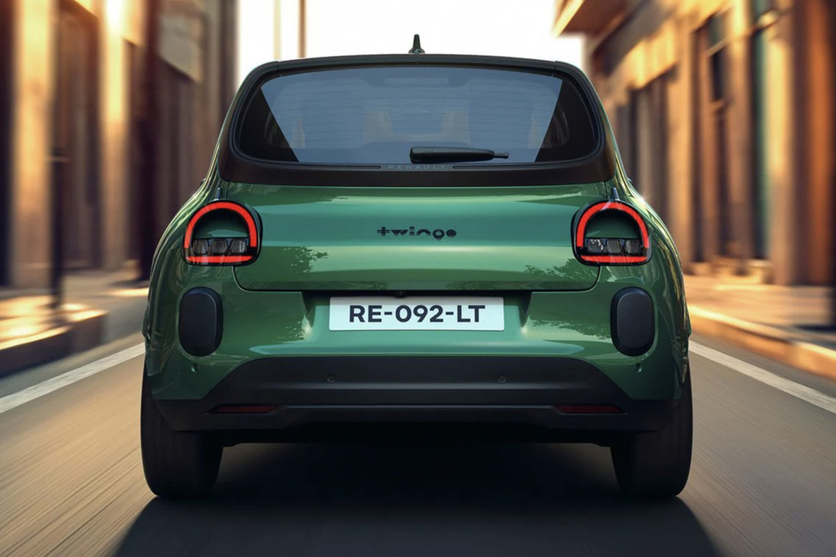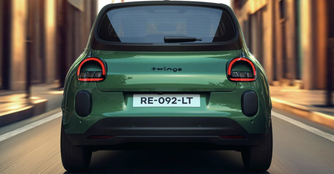 À l'arrière, on remarque surtout la signature graphique des feux et le nom ‘Twingo’ placé au centre. Contrairement à la partie avant, vous ne trouverez pas de logo Renault ici.