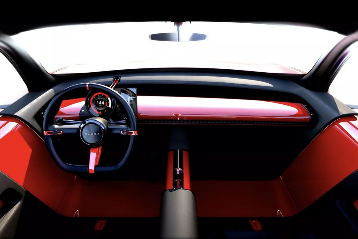 L'intérieur est d'une simplicité radicale. Pas d'écran d'infodivertissement classique : Mazda s'attend à ce que les conducteurs utilisent simplement leur smartphone. Pour le reste : tableau de bord minimaliste, volant à méplat et cadran d’instrumentation digital circulaire. C’est une leçon de sérénité et de clarté, mais aussi une rupture nette avec le désordre habituel des planches de bord.
